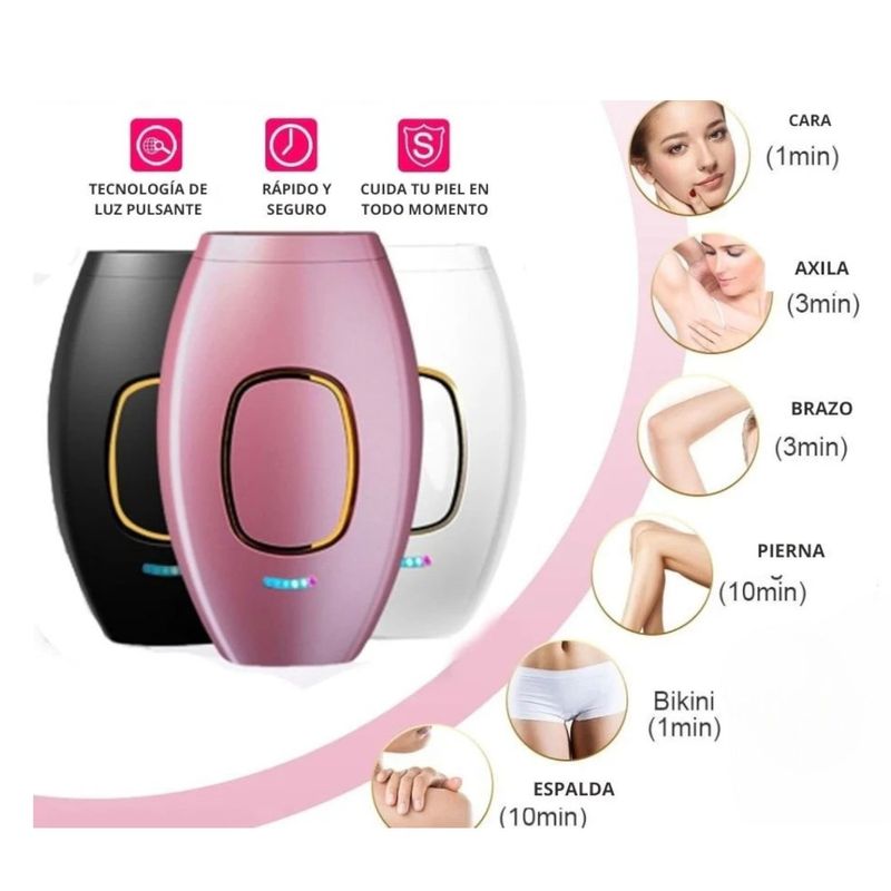 <p>Disfruta de una piel suave y libre de vello desde casa con esta depiladora de luz pulsada (IPL). Su diseño compacto y seguro permite eliminar el vello de forma indolora en rostro, axilas, brazos, piernas y zona bikini. Cuenta con diferentes niveles de intensidad para adaptarse a cada tipo de piel y resultado duradero con uso constante. Incluye gafas de protección y cargador para mayor seguridad y comodidad.</p> <p> </p> <p>DETALLES</p> <p> </p> <ul> <li>Tecnología IPL de luz pulsada para reducción progresiva del vello.</li> <li>Uso en múltiples zonas: rostro, brazos, axilas, piernas y bikini.</li> <li>Diseño ergonómico y compacto, fácil de manejar.</li> <li>Varias intensidades para adaptarse a diferentes tipos de piel.</li> <li>Tratamiento indoloro y seguro para uso en casa.</li> <li>Resultados visibles tras pocas sesiones con un uso adecuado.</li> </ul> <p>*IMPORTANTE* El color del producto puede variar, según la disponibilidad en el momento*</p> <p>**INFORMACION IMPORTANTE **El color de la foto es referencial para que puedas ver los atributos del producto y al mismo tiempo es la opción 1 nuestra de despacho. Pero dejamos la aclaración para que lo tengas presente por si te llegara en otro color. **</p> <p>NOTA : La foto de este producto ha sido ambientada, por lo cual no incluye ningún adorno, ni accesorios, ni piezas adicionales ni ningún otro elemento que lo acompañan.</p> <p>Observaciones De Garantía: 1 Mes**** La garantía de este producto es exclusivamente por defectos de fábrica, no por daños ocasionados por mal uso o por desconocimiento de uso del cliente. La garantía se tramitará bajo las políticas, términos y condiciones establecidos por la empresa. ****</p>