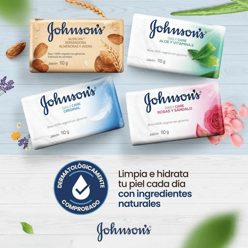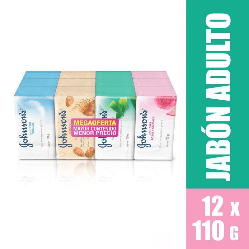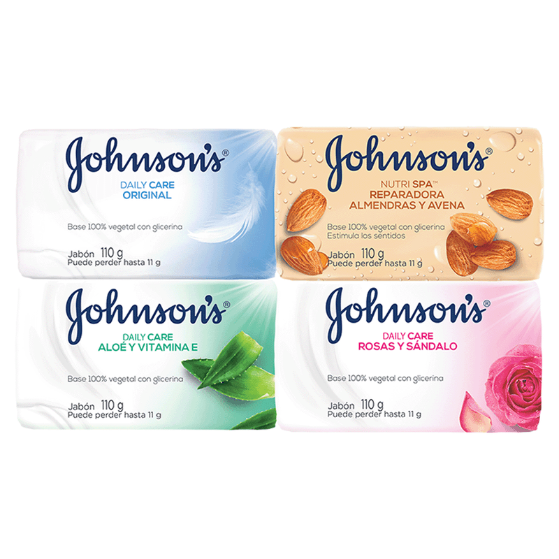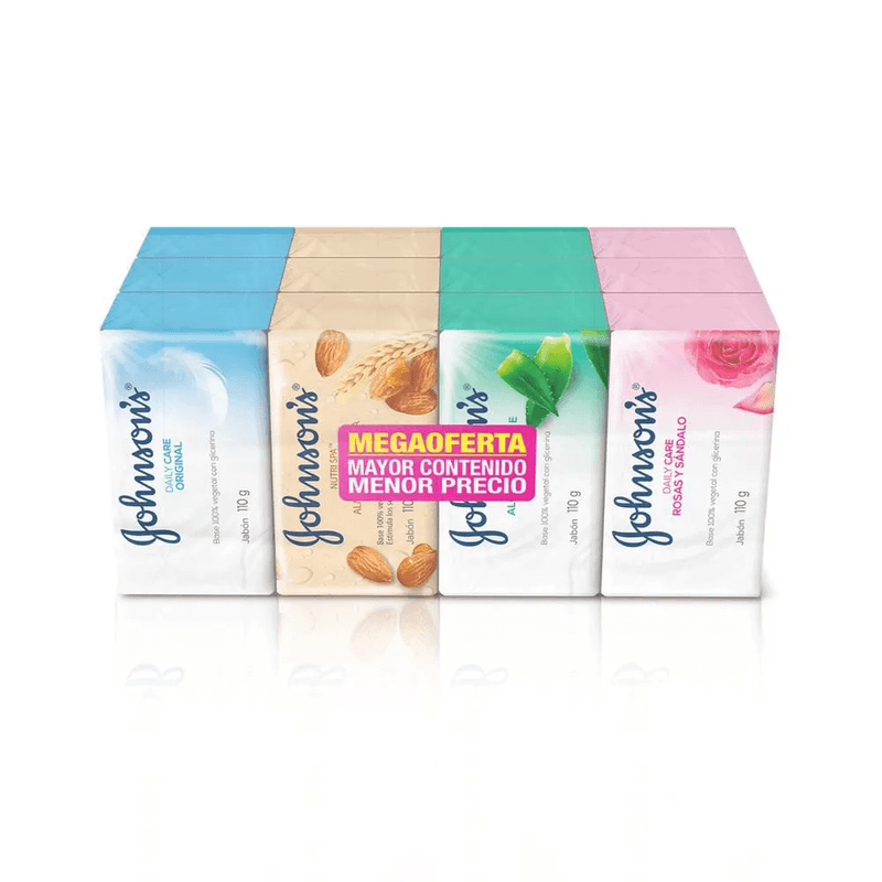 Pack de jabones en barra para el baño del cuerpo y manos de uso cotidiano. Johnson's Jabón Surtido 12 Unidades. Cada barra es de 110 g es un producto perfecto para aquellos que buscan una limpieza suave y efectiva para su piel. Con una variedad de aromas y fórmulas, estos jabones cuidan gentilmente de tu piel gracias a sus agentes hidratantes e ingredientes naturales. Con cuatro variedades de jabones para elegir, cada uno diseñado para satisfacer diferentes necesidades de la piel, es fácil encontrar el jabón perfecto para ti. Ya sea que prefieras el aroma de rosas y sándalo, la suavidad de la avena y el aceite de almendras, la nutrición renovadora o la fórmula original, todos están dermatológicamente comprobados para asegurarse de que sean suaves y seguros para tu piel. El pack incluye 12 unidades de 110 g cada una, lo que significa que tendrás suficiente jabón para mantener tu piel limpia y suave durante semanas. Incluye: 3 Rosas y sándalo, 3 Avena aceite almendras, 3 Aloe y vitamina E 3 Fórmula original. ¡Y no te preocupes por quedarte sin tu favorito, ya que cada pack incluye una variedad de aromas y fórmulas!